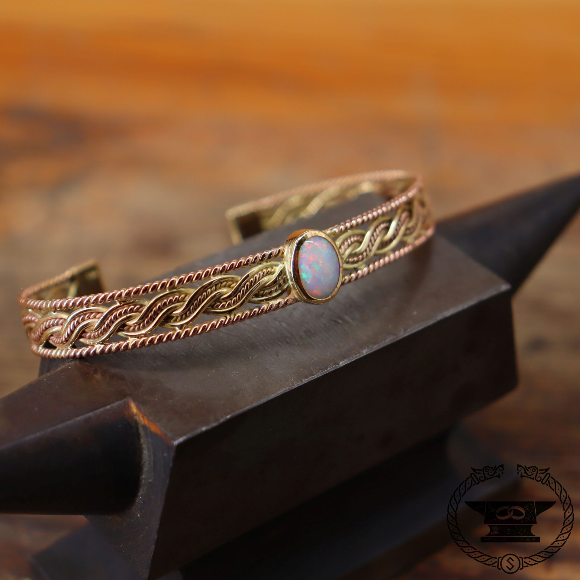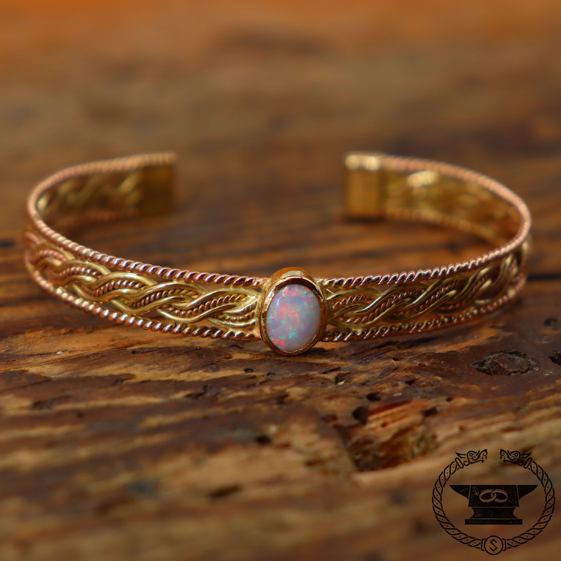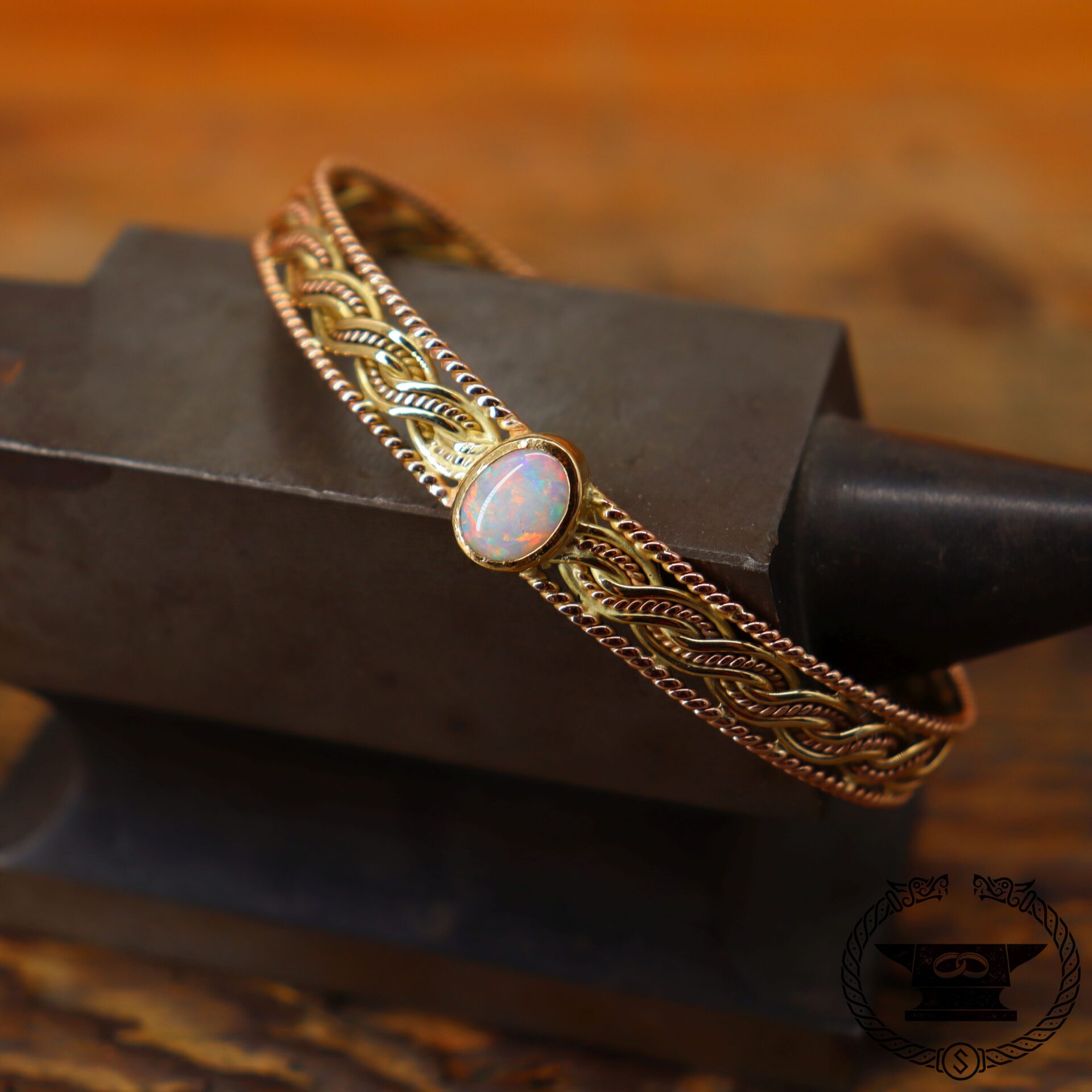 Exquisite, braided bangle made of 585 yellow gold or red gold with an Australian opal, set in 585 yellow gold.