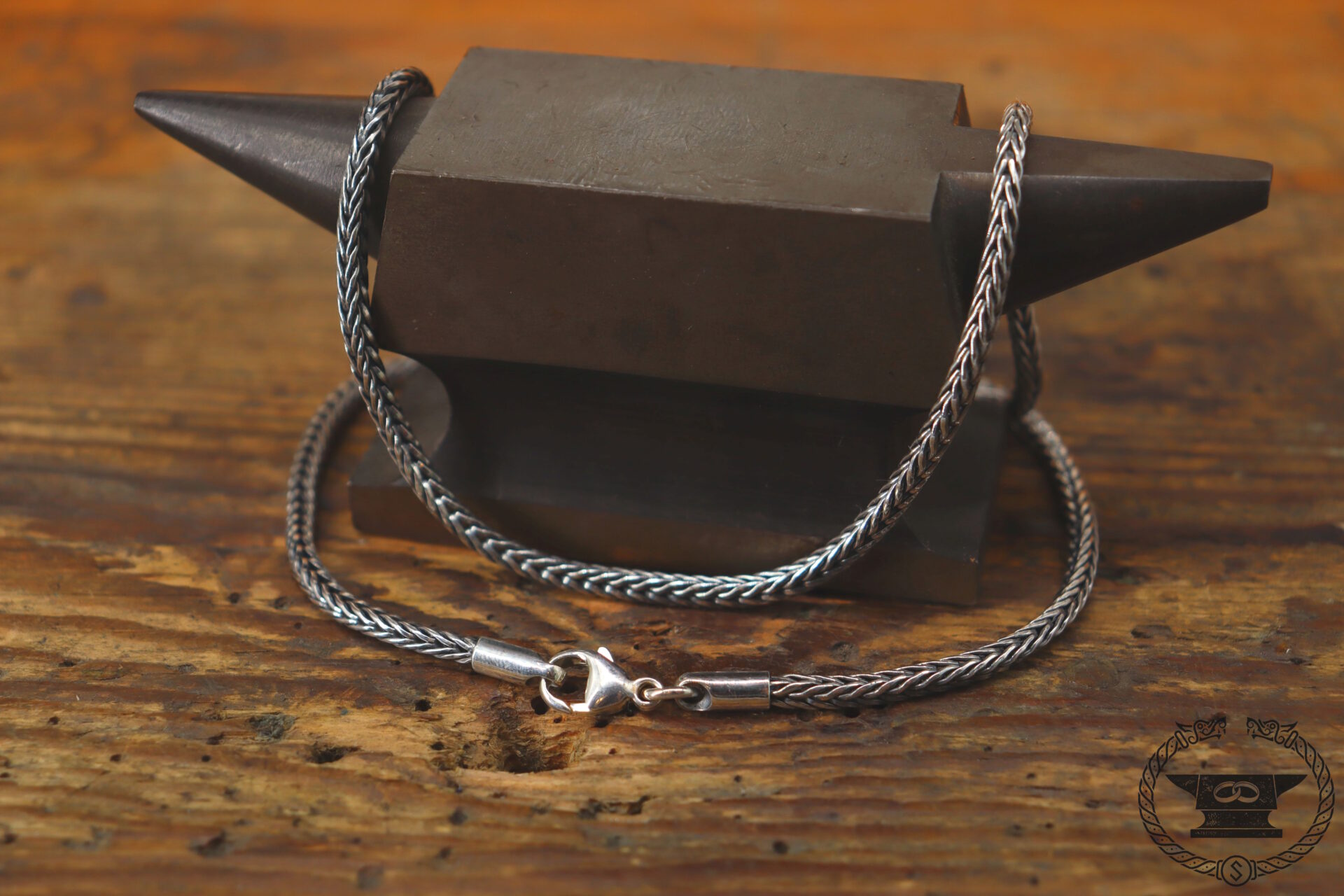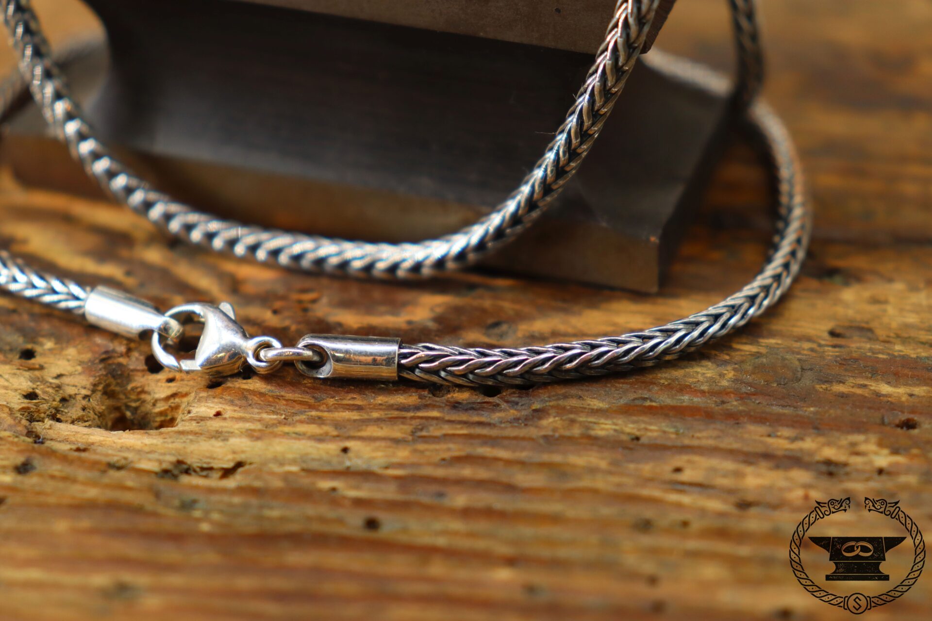 Aufwändige patinierte Fuchsschwanzkette aus Sterlingsilber mit stabilem Karabinerverschluss.