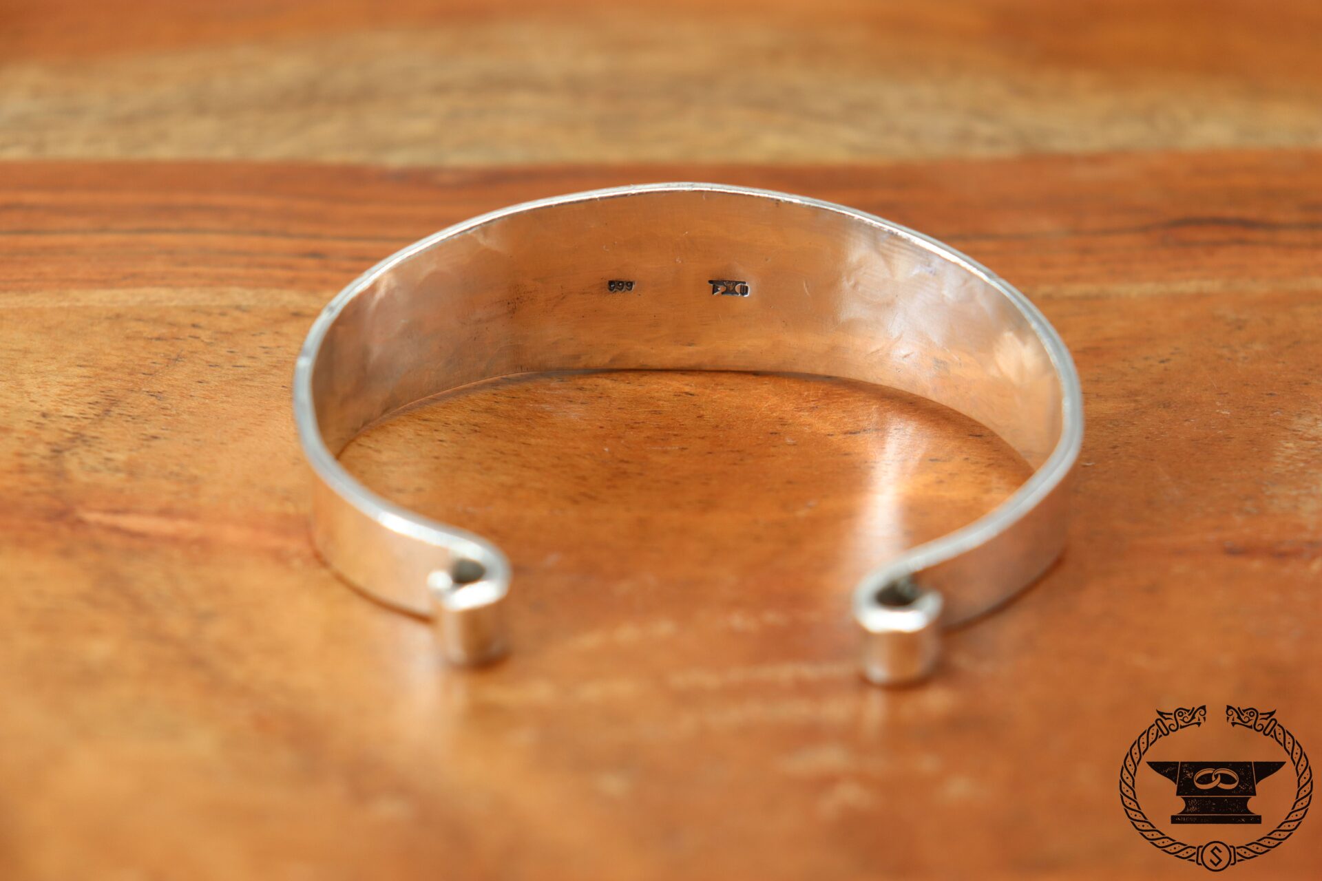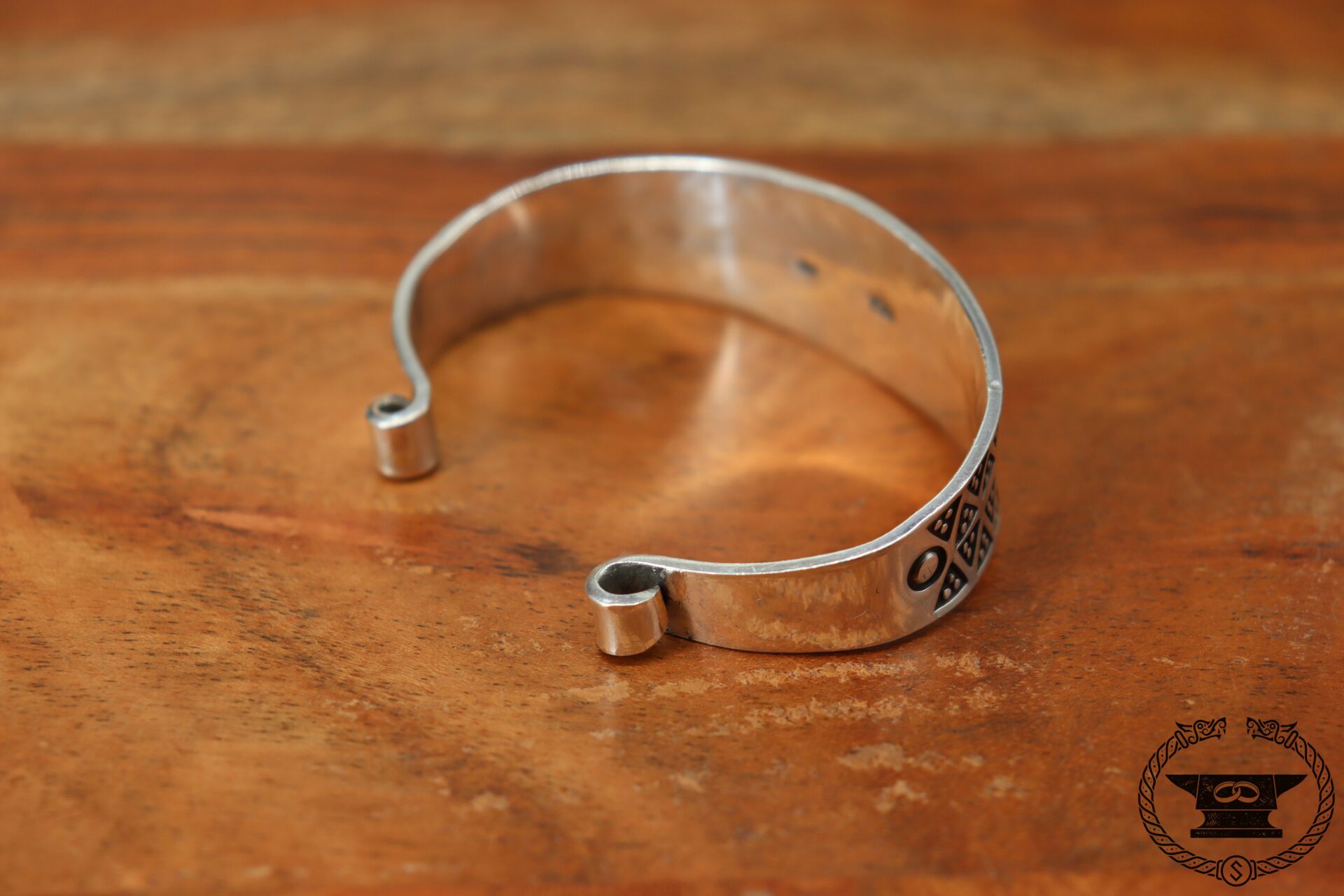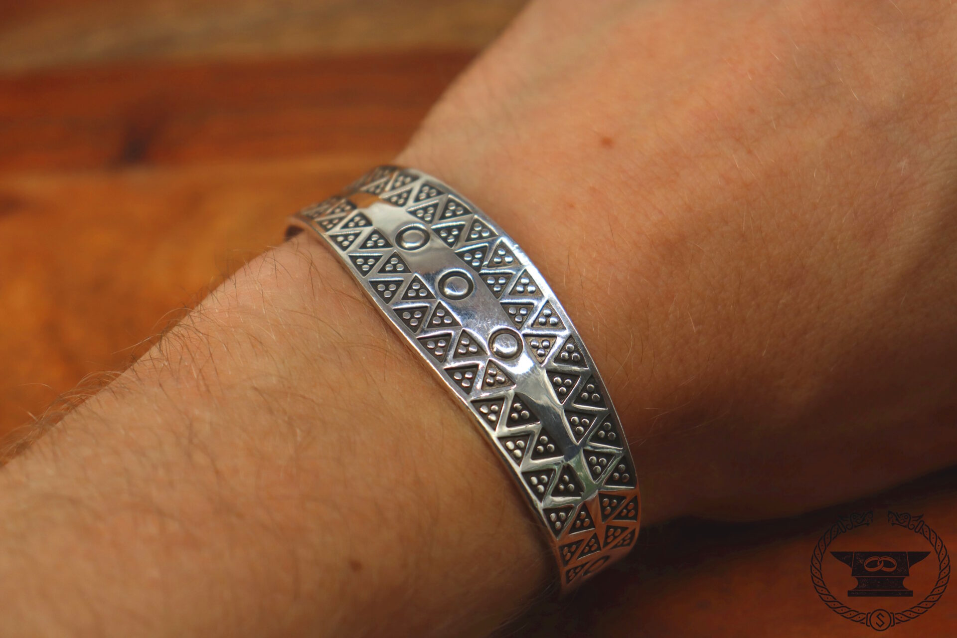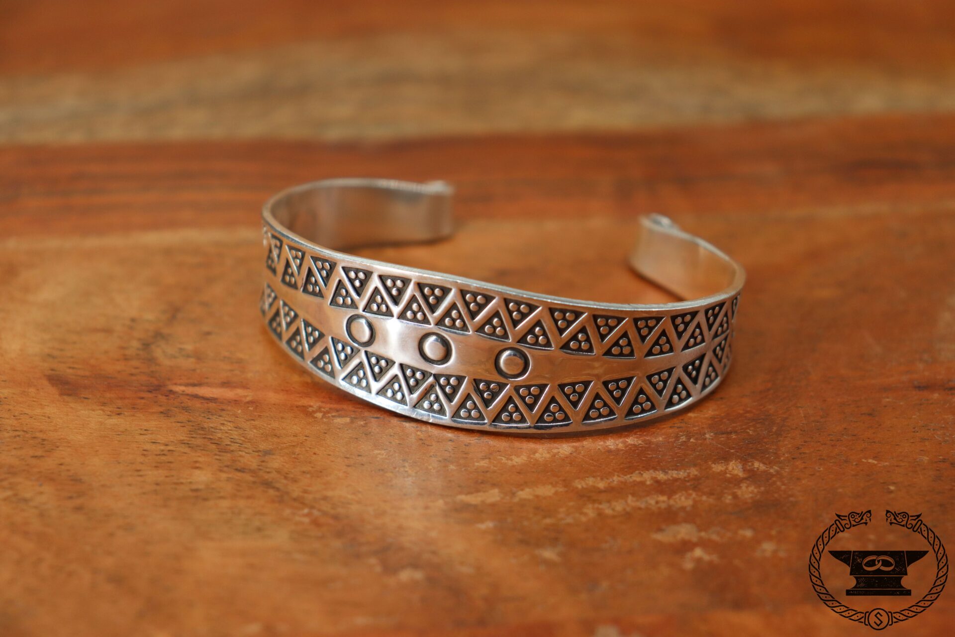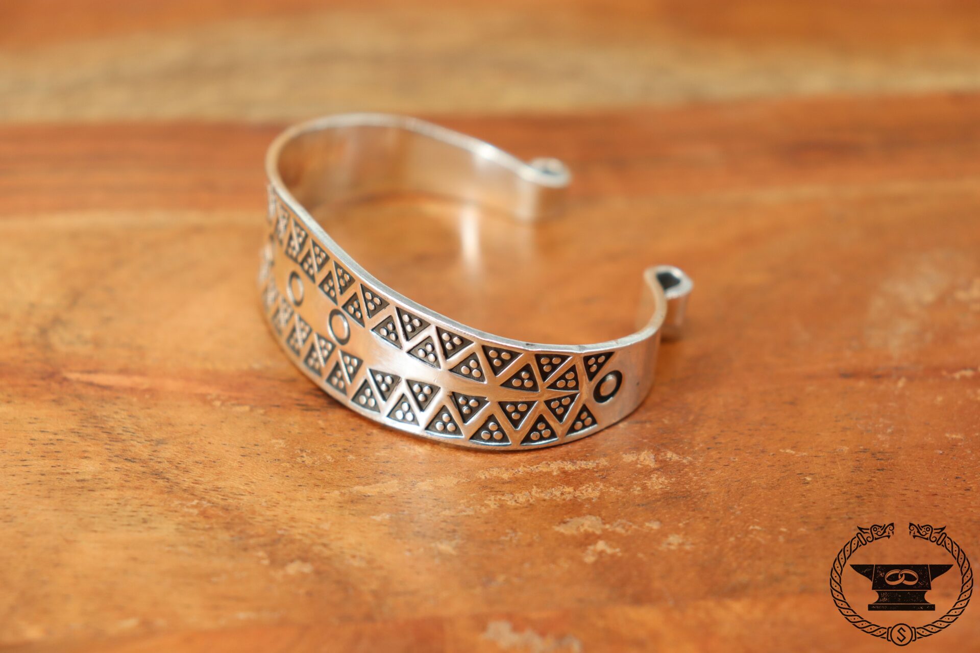Handgefertigter Wikinger Armreif von Surturs Schmiede mit Stempelmuster aus Feinsilber 999.