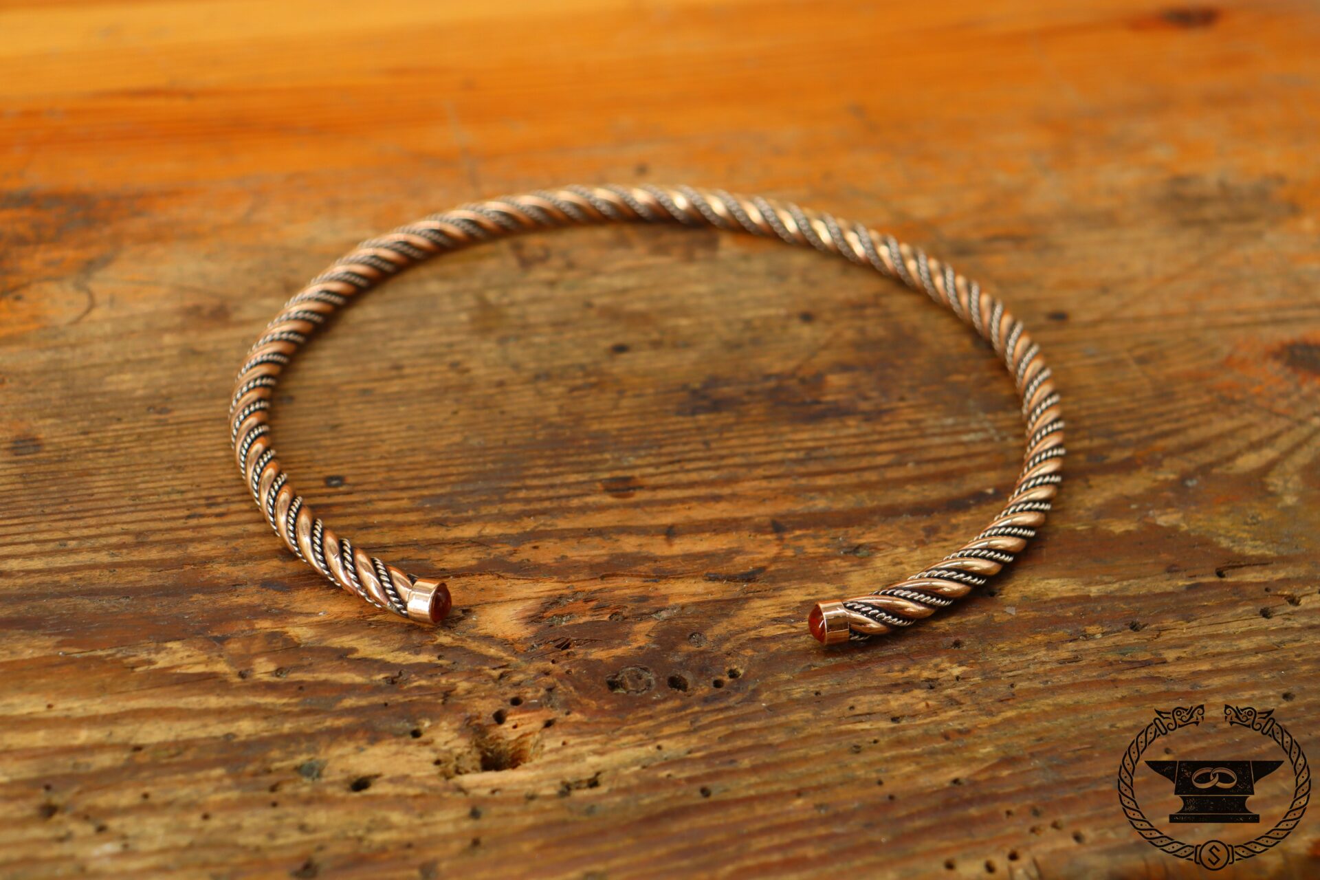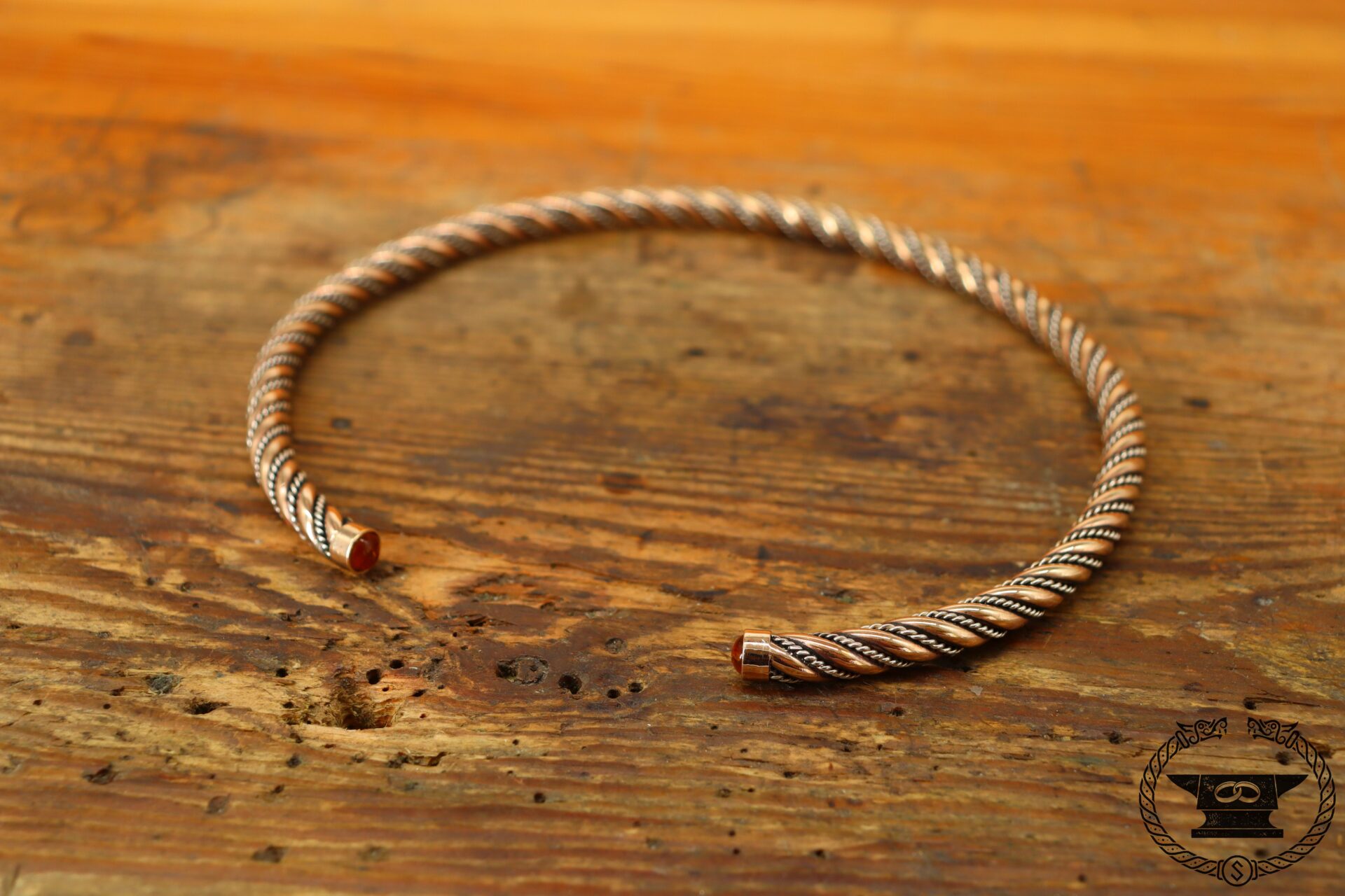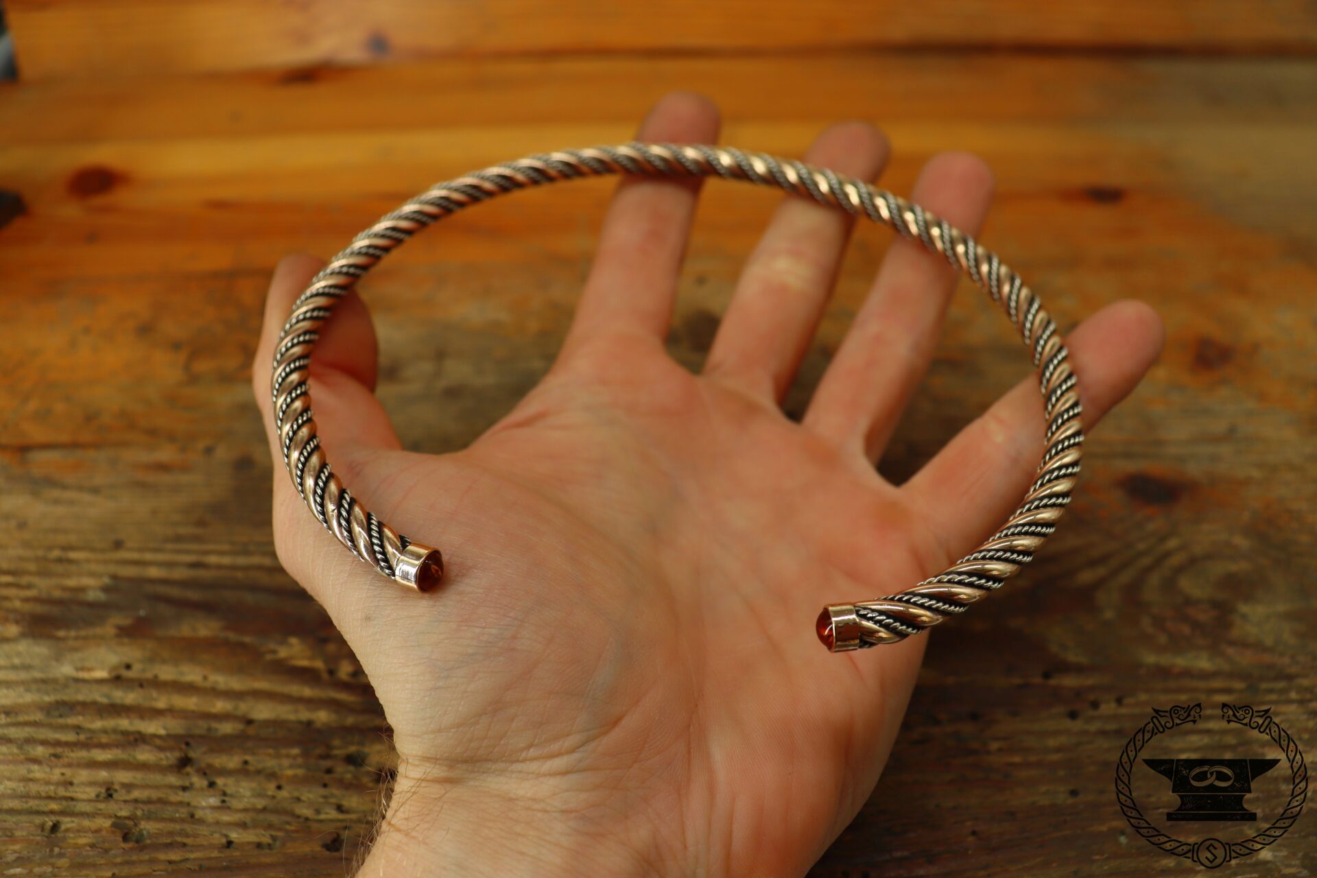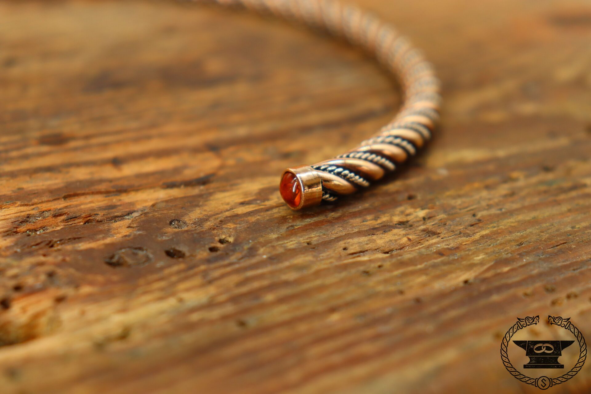 Handgemachter massiver gedrehter Halsreif aus roter Bronze, Sterlingsilber und Bernstein im Stil der Wikinger und Kelten.